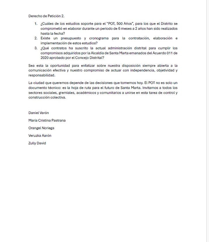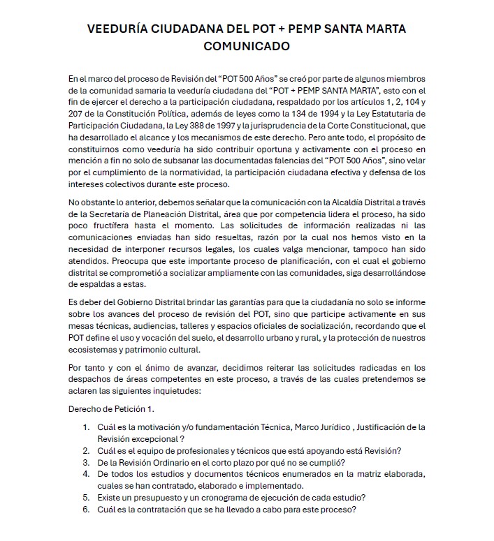 La Veeduría Ciudadana del POT+PEMP Santa Marta emtió un comunicado a la opinión pública a través del cual da a conocer las dificultades que ha debido enfrentar para desarrollar su labor de «velar por el cumplimiento de la normatividad, la participación ciudadana efectiva y defensa de los intereses colectivos durante este proceso.» Señala la veeduría que «la comunicación con la Alcaldía Distrital a través de la Secretaría de Planeación Distrital, área que por competencia lidera el proceso, ha sido poco fructífera hasta el momento. Las solicitudes de información realizadas ni las comunicaciones enviadas han sido resueltas, razón por la cual nos hemos visto en la necesidad de interponer recursos legales, los cuales valga mencionar, tampoco han sido atendidos.»
