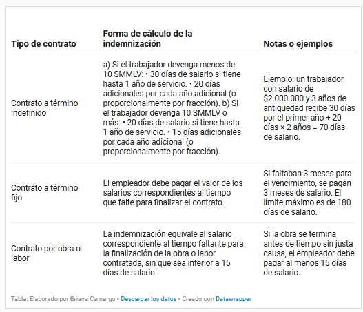 Aunque muchas personas asocian el despido sin justa causa con el pago de una suma considerable, en la práctica las indemnizaciones laborales no siempre representan montos elevados. Esto se debe a que la ley colombiana como pudieron observar, establece fórmulas proporcionales al tiempo de servicio, al tipo de contrato y al salario devengado, según lo dispuesto en el artículo 64 del Código Sustantivo del Trabajo, modificado por las Leyes 50 de 1990 y 789 de 2002 y también se debe a que el monto de la indemnización no es un premio por los años trabajados, sino una compensación económica proporcional al perjuicio causado por la terminación injustificada. Por ello, su valor varía según la duración del vínculo, el salario y el tipo de contrato, de manera que solo en ciertos casos alcanza sumas significativas.